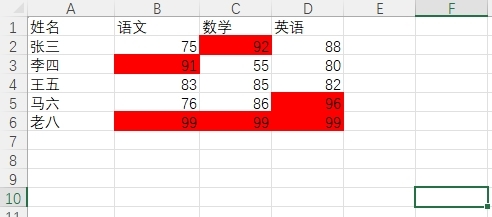 此外,我们可能会看到有些表格中,会有各种各样的高亮,除了部分是制作者自行添加的以外,其实还有条件格式;通过这一功能,我们可以快速将自己需要的一些内容筛选出来,比如“成绩大于90分的,对应成绩那一单元格涂红”。