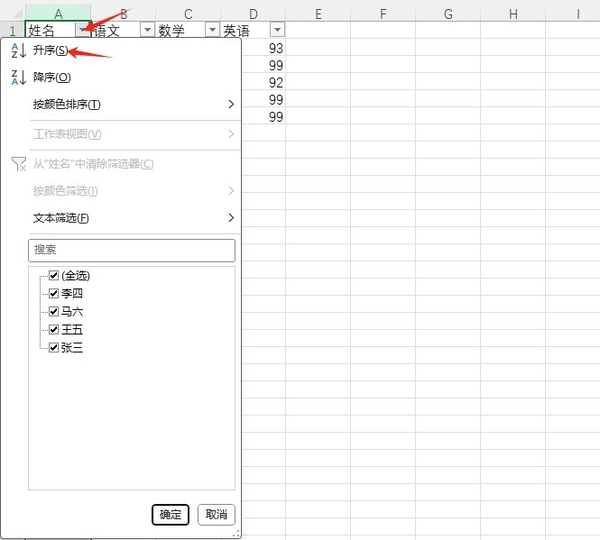 2、之后,我们可以对【姓名】这一列,进行排序(升序降序皆可);其操作位:点击姓名右边的筛选按钮,之后再点击【升序】或【降序】;