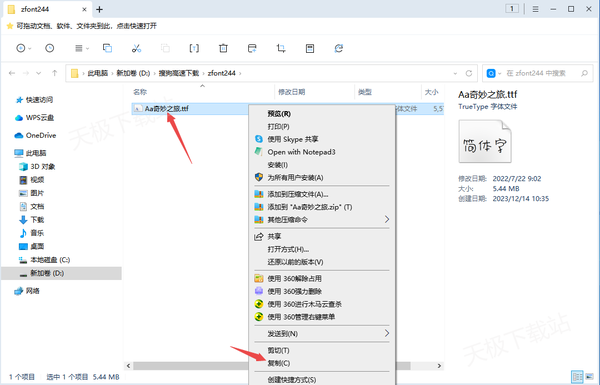 1、首先,找到自己下载的第三方新字体文件,然后进行复制。如果下载的字体文件是压缩包,需要先进行解压缩,然后在复制字体文件。