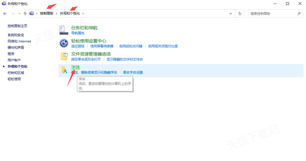1、还是进入到电脑系统的【控制面板】中,然后选择【外观和个性化】选项,接着再点击【字体】选项并进入。