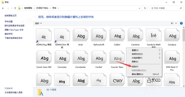 3、紧接着,在字体文件右侧的空白处,按下鼠标右键,接着选择【粘贴】,然后新的字体就会进行安装了。