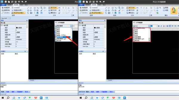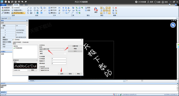 5、最后,启动风云CAD编辑器,然后添加文字,然后在【文字字体】选项中,就可以看到刚刚新添加的字体了,点击进行设置使用即可。如果字体安装前,风云CAD编辑器已经启动了,此时进行软件重启即可看到新导入的字体。
