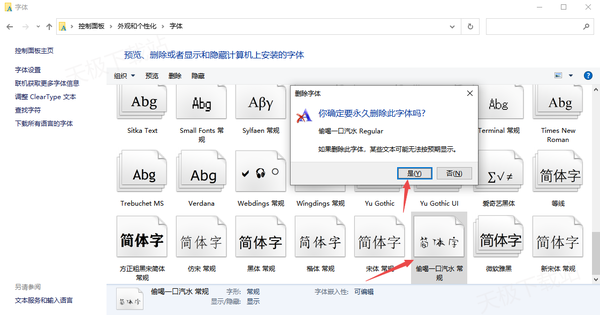 2、然后,在字体界面中,找到自己导入的字体样式文件,然后按下键盘上的【Delete】删除键,然后在弹出的提示框中,选项【确定】按钮。