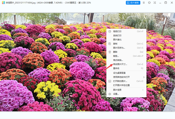第二步,图片使用2345看图王打开好以后,在图片上按下鼠标右键,然后选择【修改图片尺寸】选项。