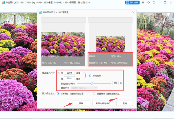 第三步,最后,在修改图片尺寸界面中,根据自己的实际需求,调整修改图片的尺寸,最后点击【保存】或【另存为其他格式】即可。