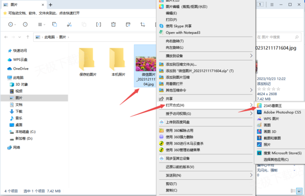 第一步,在电脑上找到要修改尺寸大小的图片,然后按下鼠标右键,在【打开方式】中,选择【2345看图王】。