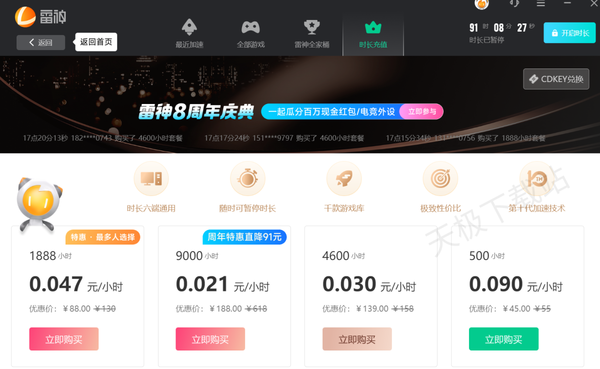 2.性价比方面,雷神加速器采用分钟计费,可以随时暂停加速时长,价格方面也不贵,而且经常有优惠活动,性价比非常高。