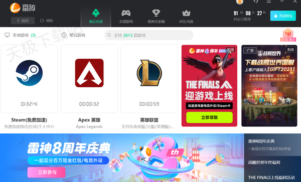 1.加速效果方面,雷神加速器算不上最好的一款,但也绝对不差,大家周末无聊在家玩玩游戏,每天不超过4个小时,完全够用;