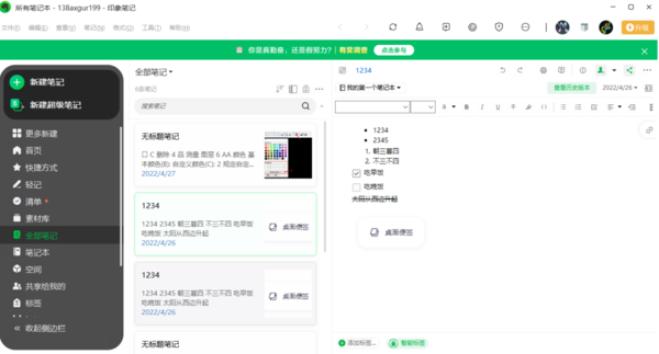 印象笔记,一款云端技术发达的笔记软件,在这里我们不仅能以笔记、清单、便签、导图等方式记笔记以外,它还是一款可以帮我们备份的软件,如果在座的各位需要经常在电脑上进行文字撰写,那不妨在完成每日进度后,往印象笔记中拷一份,实现备份,因为印象笔记的云端存储技术可以帮助我们避免文本数据丢失。