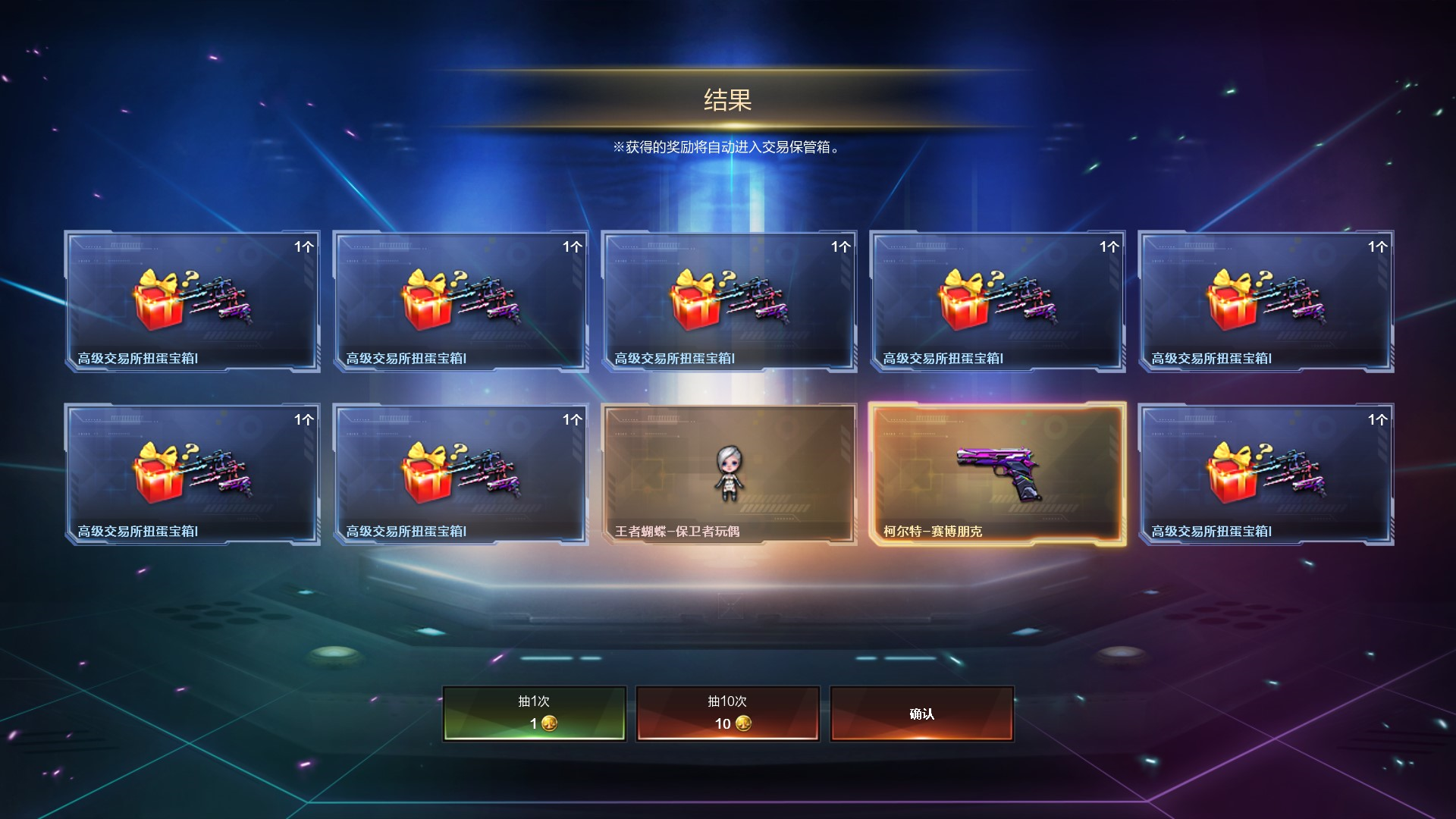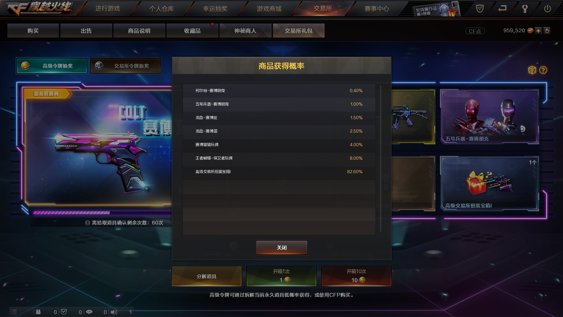 最后和大家简单介绍一下,全新上线的赛博朋克系列武器道具的获取方式。对于各位小伙伴们仓库中的闲置道具可以分解为交易所令牌,通过开箱抽取高级令牌和其他道具(如上图)。
