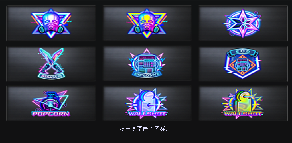 除了前面介绍的武器和角色,还有一些其他的装饰类物品,比如全新的赛博朋克击杀图标,充满了科技感。还有击杀特效图标,如下。