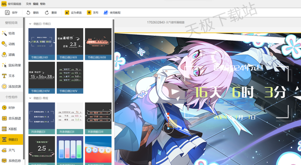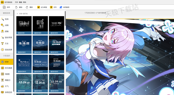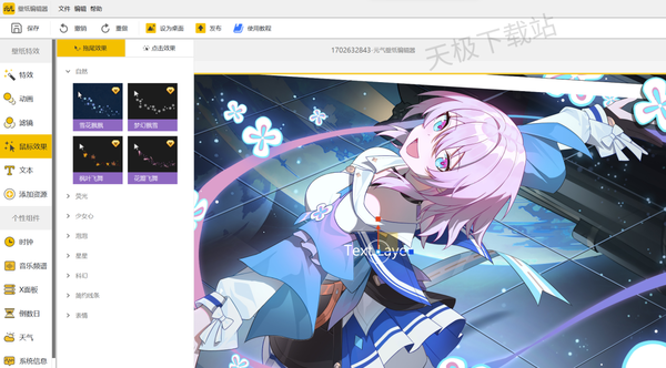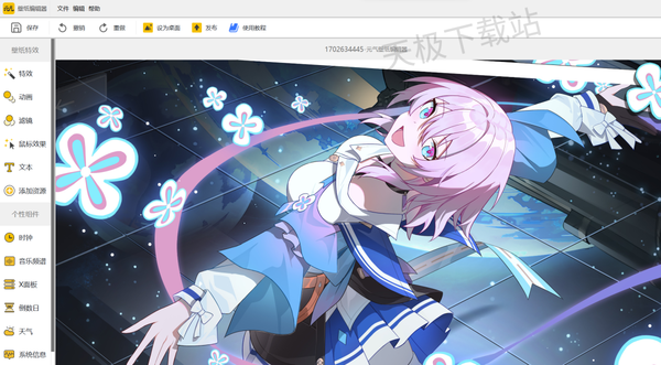 元气桌面是一款非常专业好用的动态桌面制作软件,使用元气桌面的壁纸编辑器功能,你可以随意为自己喜欢的壁纸加上任何效果,比如特效,动画,滤镜,文本,也可以添加文本,时钟,天气等,甚至还可以为电脑制作主题设计。