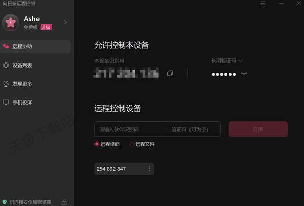 2.打开手机端,输入电脑的设备识别码和长期验证码,点击远程协助。