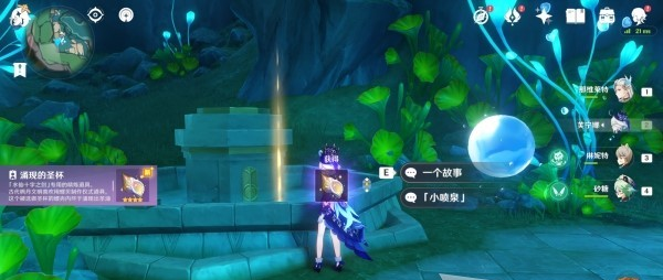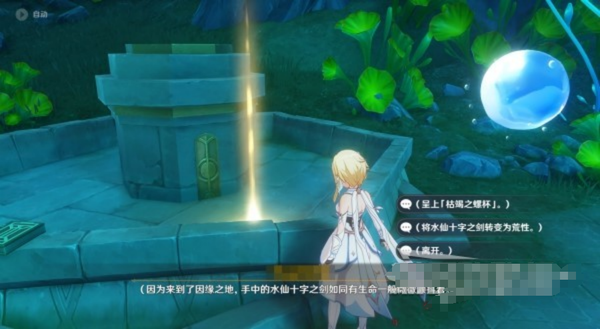 4,与喷泉互动选择小喷泉,选择呈上枯竭之螺杯就能将枯竭之螺杯转换成涌现的圣杯了,而且这个地方还能够转换水仙十字之剑的始基力属性,这是与水仙十字之剑的武器特效有关的。