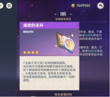 以上就是关于4个枯竭之螺杯和涌现的圣杯获取方法啦,这样就能够使用“枯竭之螺杯”来转换“涌现的圣杯”了,然后使用“涌现的圣杯”就可以精炼水仙十字之剑了,你学会了吗。