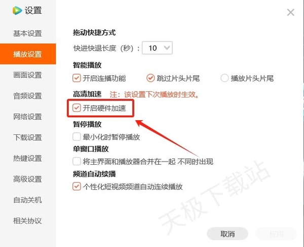 ②接着,我们在左侧设置栏中找到播放设置,然后关闭高清加速下的硬件加速。
