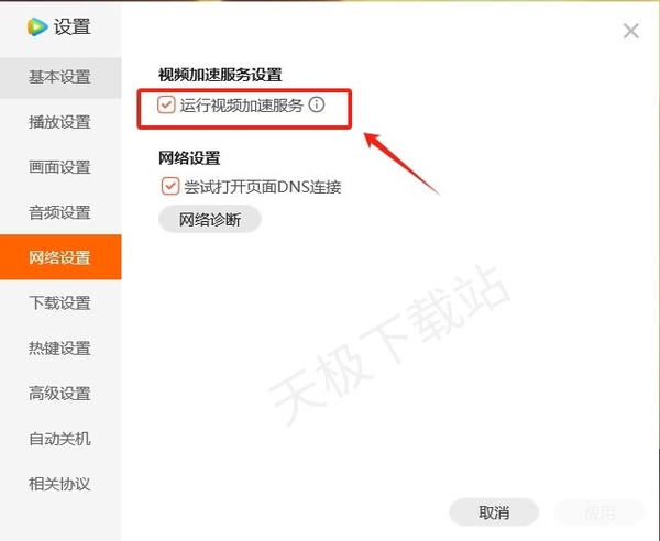 ③然后,继续找到网络设置,打开运行视频加速服务。