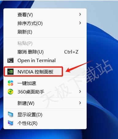 ①在桌面上,鼠标右键打开NVIDIA控制面板。