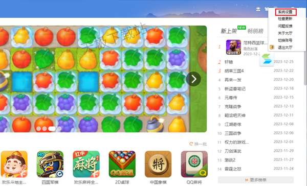 1.打开电脑QQ游戏大厅客户端,点击右上角“三条横线”,选择“系统设置”。