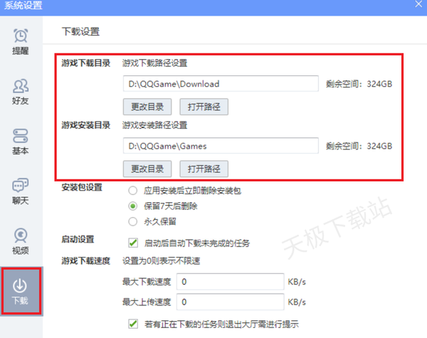 2.进入设置界面后,选择最下方“下载”,在这个界面我们可以看到“游戏下载目录”和“游戏安装目录”,可自由更改,下方还有安装包以及下载速度的设置。