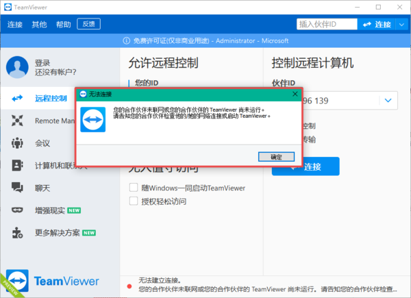 第三步,如果想要控制好友的电脑,在【控制远程计算机】界面中,我们在【伙伴ID】一栏中,输入朋友的Teamviewer的ID,然后选择【远程控制】选项,再点击【连接】按钮。而想要远程控制好友的电脑的话,好友电脑上的Teamviewer软件也必须启动才行。