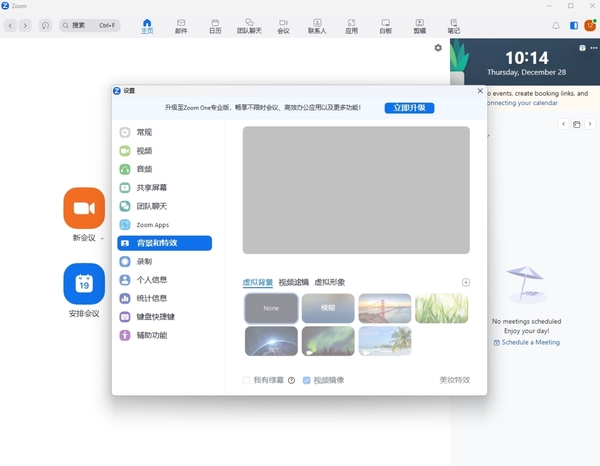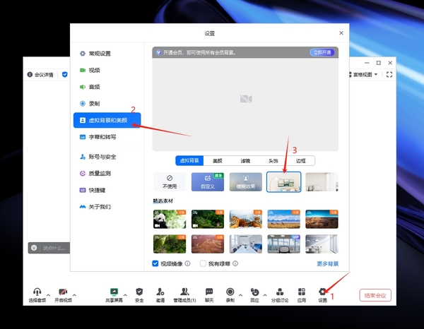 如果说上述两款会议软件,是更多被国内使用;那ZOOM则是世界多国都很认可的会议软件,因此它也会被很多企业、组织用于线上的国际交流;以至于会议环境的隐私保护,变得更加重要。所以,ZOOM中也是有虚拟背景的,同样是会议前快速设置一番,即可直接使用。
