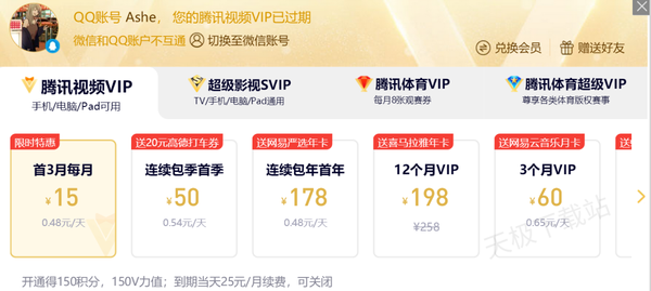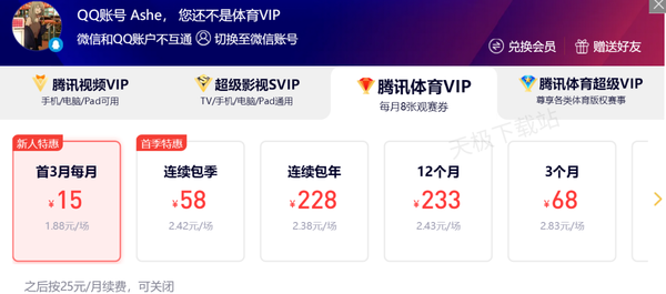 自动续费:腾讯视频VIP一个月25,前三个月15;腾讯视频SVIP一个月35,第一个月16;腾讯体育VIP一个月25,前三个月15;腾讯体育SVIP一个月60,前三月40。