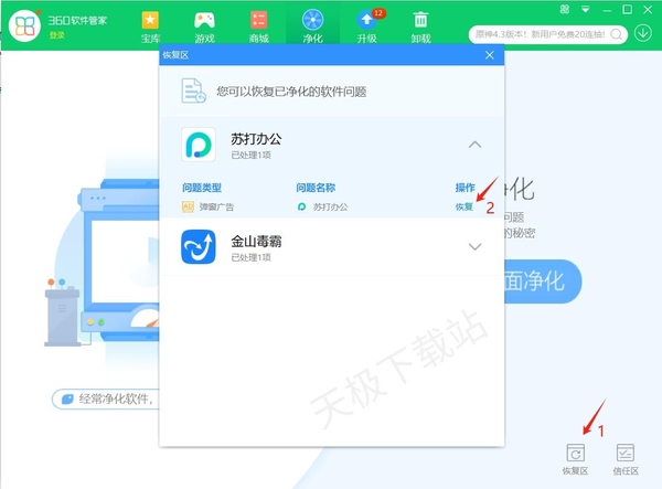 5.如果需要恢复已净化的软件问题,只需在净化界面,点击下方的恢复区,选择需要恢复的软件,点击后面的下拉箭头,选择恢复即可。