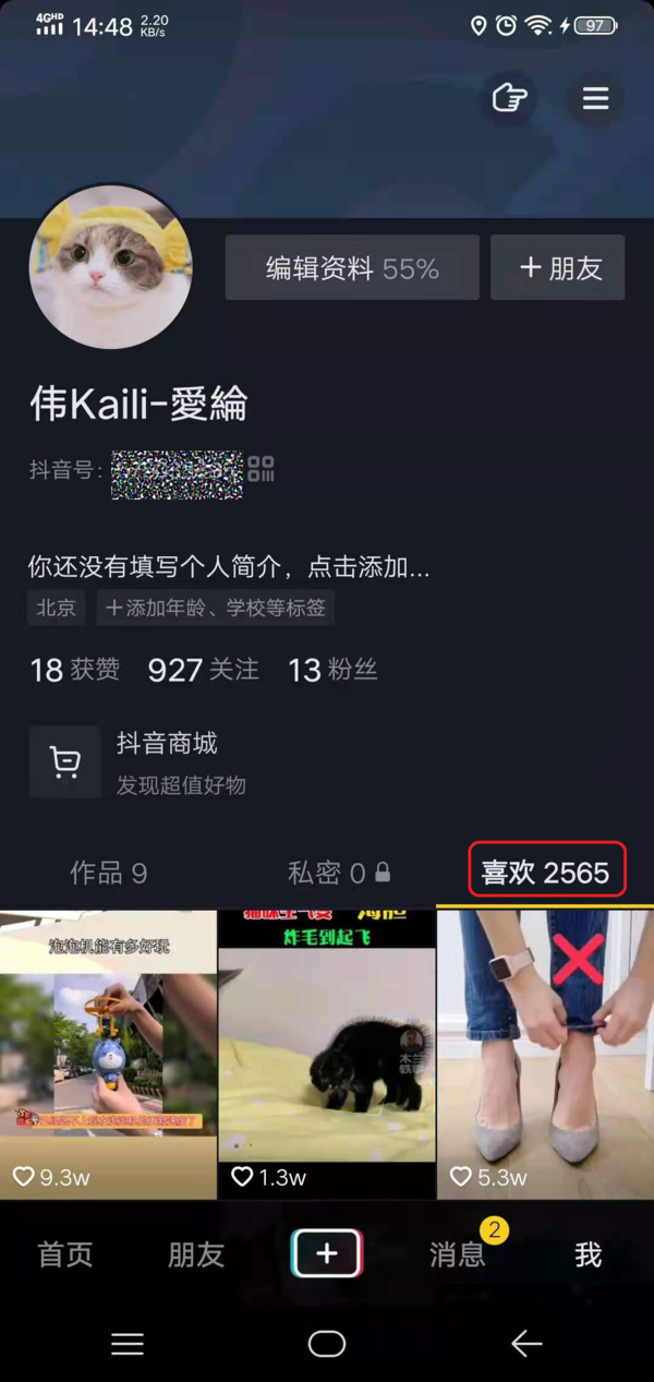 第二步,进入到我的主界面当中后,我们在此界面中,就可以看到自己发布的【作品】以及自己【喜欢】的作品了。点击【喜欢】选项。