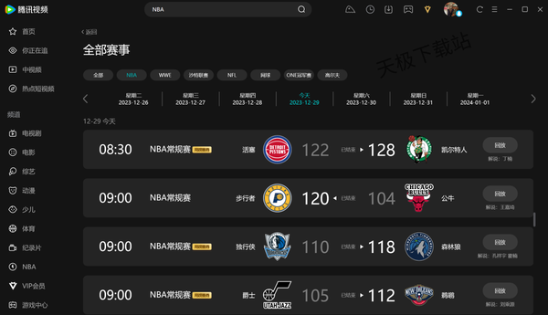 2.在这里上方选择NBA后,可以看到最近的赛事赛程,没开始的可以预约,结束的也可以观看全场回放,后面还有每一场的解说嘉宾。