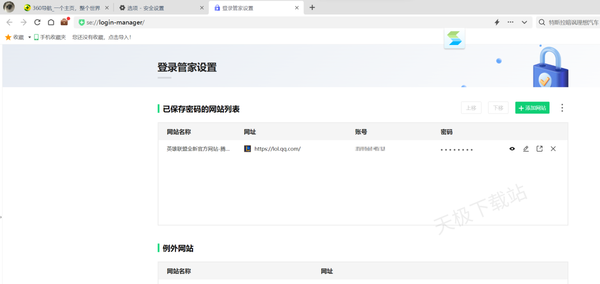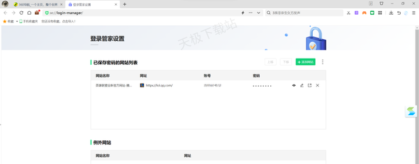 2.这样我们就进入了登录管家设置,在这里可以查看我们之前登录网页保存的账号密码。