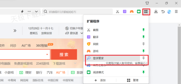 1.打开360浏览器客户端,在右上方找到“四个方块”的图标,点击然后选择登录管家,选择右边“齿轮”一样的设置按钮。
