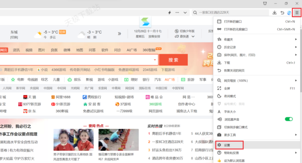 1.打开360浏览器客户端,在右上方找到“三条横线”,点击后选择下方“设置”。