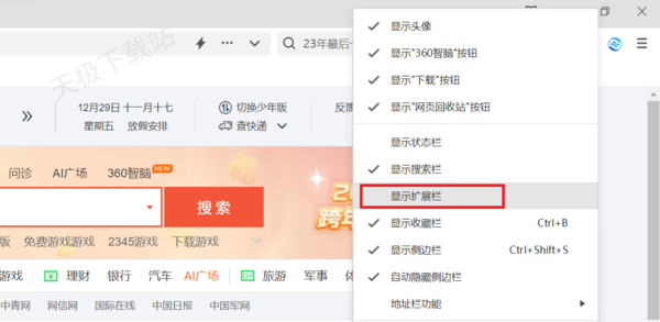 如果没找到,那说明扩展栏被隐藏,在最上方任意位置右键,选择“显示扩展栏即可”。