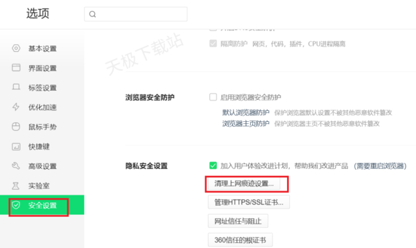 2.在设置界面左方“安全设置”,然后往下滑找到并点击隐私安全设置中的“清理上网痕迹设置”。