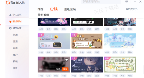 小编实际购买发现,基本上需要付费的皮肤价格在2-3块钱之间,而皮肤套装则在3-5块钱之间,皮肤套装相比皮肤多了一款电脑壁纸。这个价格对于一款输入法皮肤来说,说贵不贵,但也不算特别便宜,具体根据自身情况考虑。