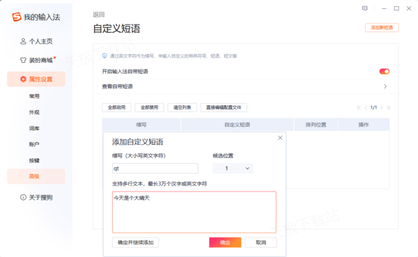 如果大家经常会使用搜狗输入法打一句话或一段话,相信大家一定每次都是手敲或直接进行复制吧,这个过程很麻烦。此时将这些话添加到搜狗自带的自定义短语中,比如用【qt】表示【今天是个大晴天】,此时大家只需要输入输入设置的这个简短的拼音,即可快速看到我们设置好的内容,选择即可进行快速输出。