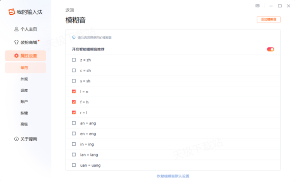 因为一些原因,有个小伙伴h和f不分,有的小伙伴l和n不分,还有小伙伴r和l不分,此时将搜狗输入法模糊音功能中的对应的模糊音勾选上,就可以更快速的进行打字了。