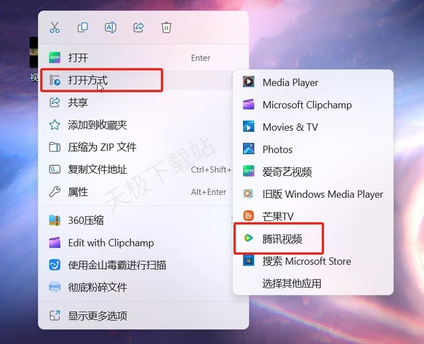 2.鼠标右击视频文件,然后将打开方式选成腾讯视频。