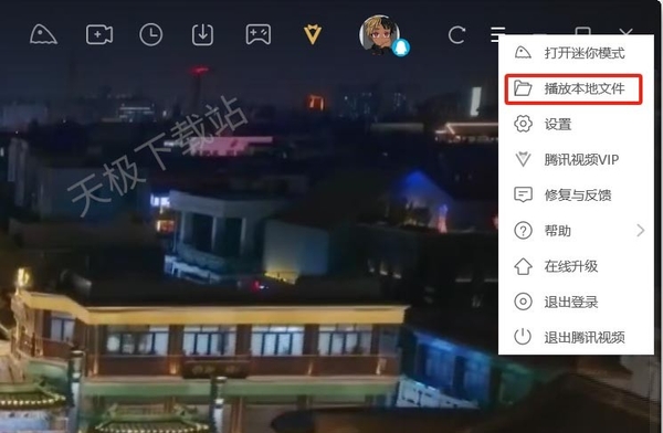 2.然后再页面右上方找到并点击三条横线的图标,紧接着选择其中的播放本地文件。