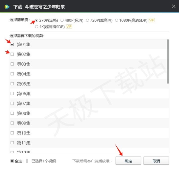 4.在下载选项中,我们可以根据自己的需求选择想要下载的剧集以及视频清晰度。选择完成后,点击确认按钮即可开始下载。