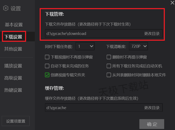 2.在设置界面选择“下载设置”,下载管理下方就是电脑爱奇艺下载视频的保存地址,可以自由更改目录,建议大家存放在D盘。