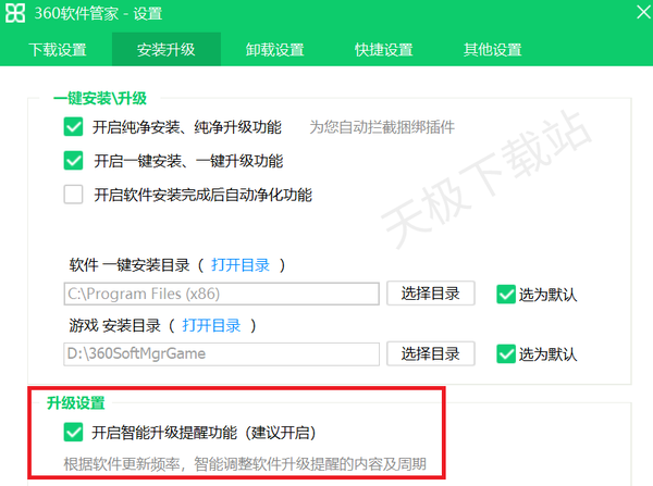 1.点击右上角向下的三角,选择“设置”,在“安装升级”里将“开启智能升级提醒功能”勾选,这样就可以即时提醒我们电脑软件版本更新。