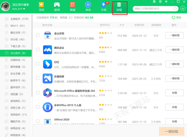 1.打开360软件管家,在上方最右边找到“卸载”,在这里可以对电脑软件进行批量一键清理,左边还有软件分类帮助用户更快地找到软件。