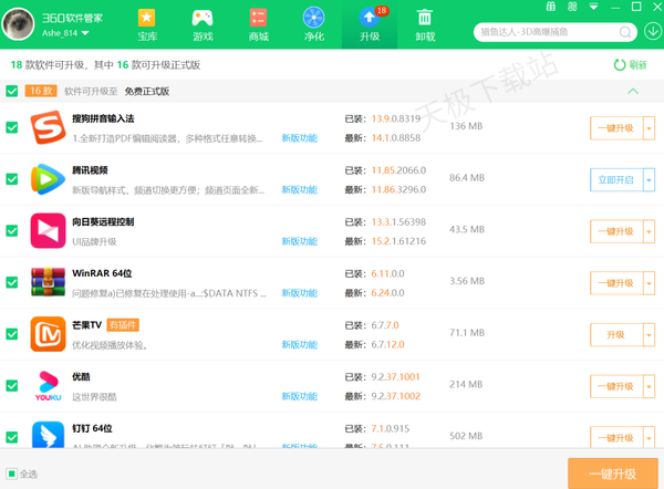 2.也可以在首页“升级”页面手动升级,勾选需要升级的软件后,点击“一键升级”即可。