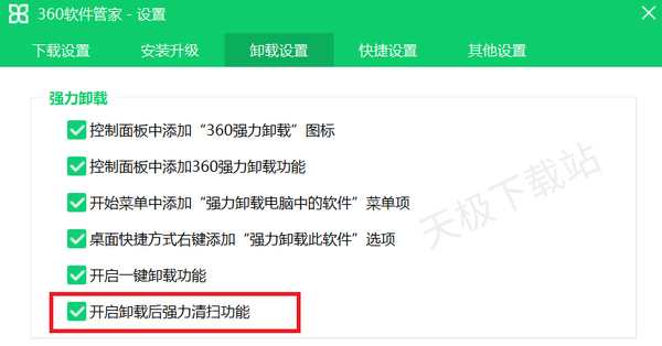 2.点击右上角向下的三角,选择“设置”,在卸载设置,可以将“开启卸载后强力清扫功能”,可以保证卸载后无残留。