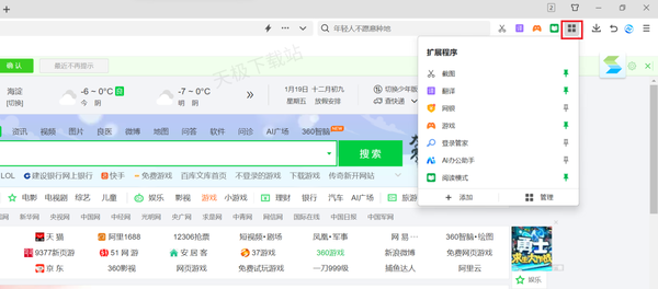 1.打开360浏览器,点击右上角四个方块即可看到已安装的插件,还有“管理”和“添加”选项。