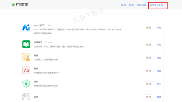 3.点击“添加”或在管理页面点击“添加更多扩展”,我们可以选择自己需要的插件进行下载安装。