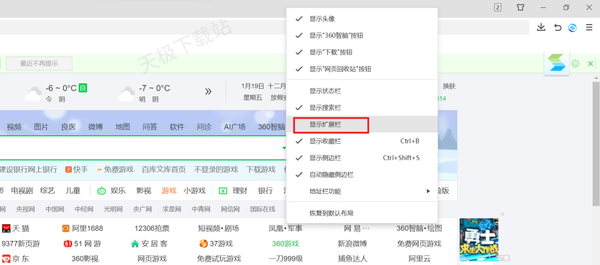 如果没有找到右上角四个方块的话,在浏览器上方空白处右键,选择“选择显示扩展栏”即可。
