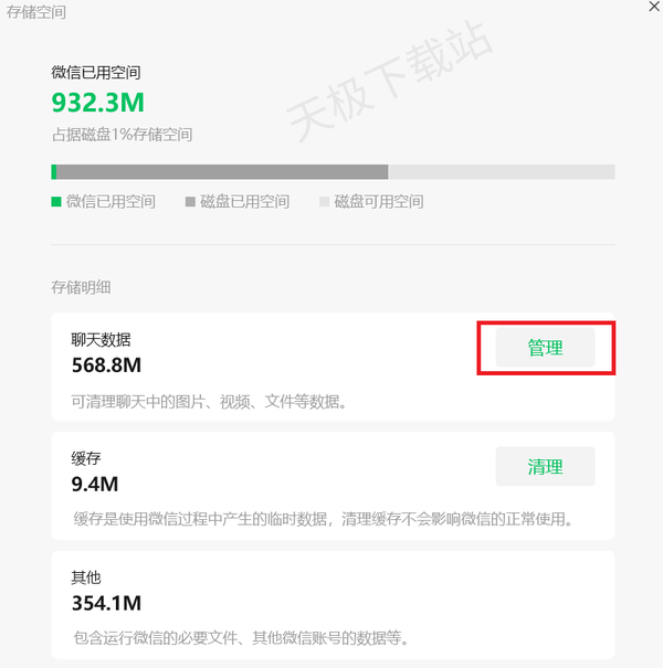 3.可以直接进行缓存清理,也可以点击“聊天记录”后方“管理”,对所有群聊和用户的聊天信息进行单独清理。